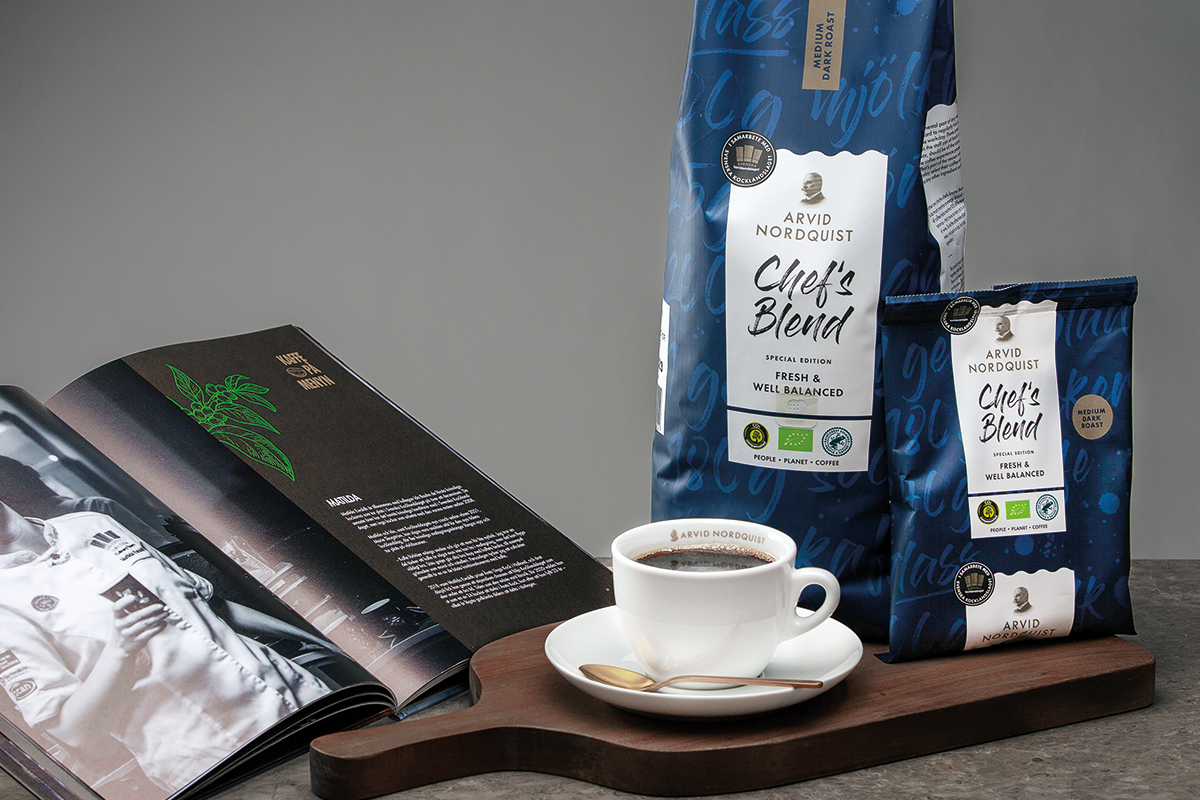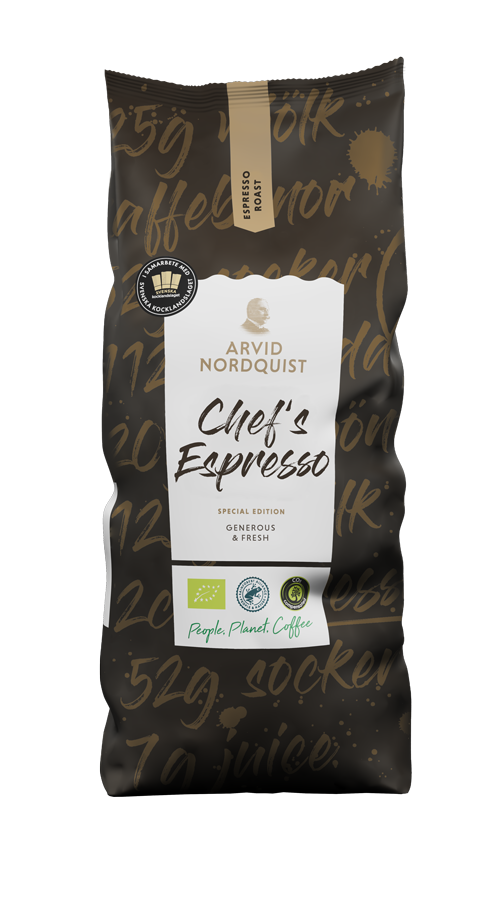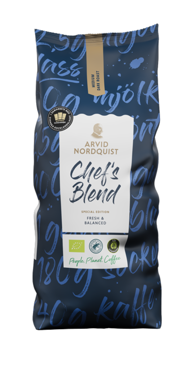Kaffe er en vesentlig del av de aller fleste kafé- og restaurantbesøk. Å unne seg et øyeblikk av nytelse og la den første slurken få tiden til å stoppe opp en stund. En kaffe er så mye mer enn en drikk. Kaffebønnen inneholder mer enn 800 aromastoffer, som er dobbelt så mange som i vin. Så la kaffen ta større plass, både som hovedkomponent og et komplement. Til desserter, marinader, rotgrønnsaker eller hvorfor ikke til dressingen. Mulighetene er endeløse. Derfor ønsker vi i Arvid Nordquist, sammen med Sveriges Kokkelandslag å gi kaffe større plass på menyen. Det er vanlig å se en kopp kaffe ved siden av maten, men vi ønsker å se mer kaffe på menyen. Da er det få som er bedre kvalifisert til å vise hvordan det kan gjøres på en inspirerende og profesjonell måte enn kokker i bransjen. Chef´s Blend serien er spesialutviklet av Arvid Nordquists og i samarbeid med det Svenske kokkelandslaget. Innkjøpsteamet til Arvid Nordquist har valgt ut de fineste Arabica-bønnene med omhu, og sammen med bransjens beste kokker har de utviklet flere oppskrifter. Bønnene er på sin side skånsomt brent på vårt fossilfrie kaffebrenneri. Vi har valgt ut bønnene med omhu til våre unike blender i Chef´s serien – et resultat av Arvid Nordquists kaffeteam og det svenske kokkelandslaget.